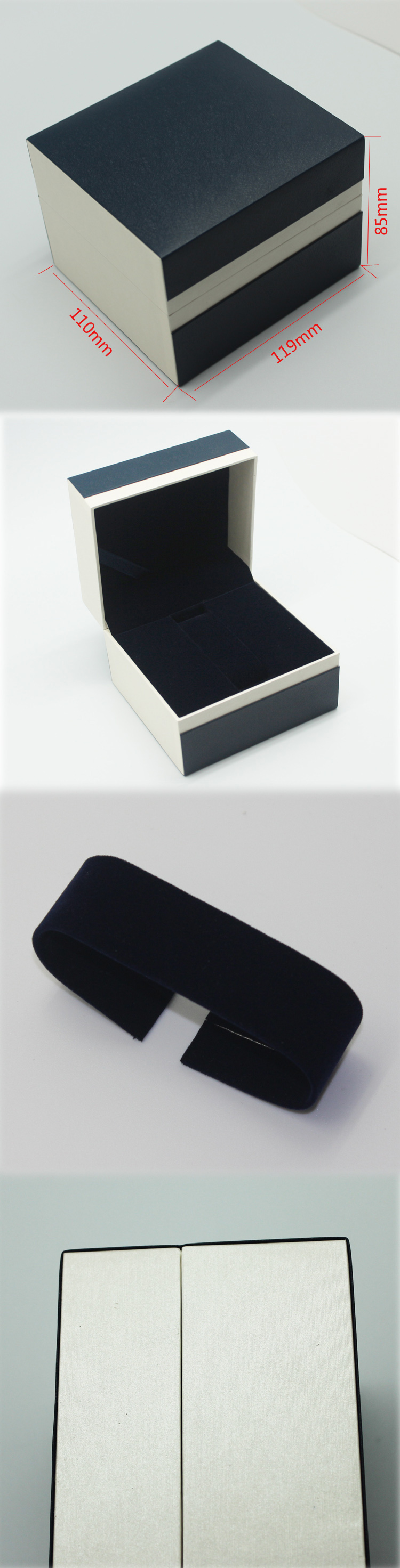 編號(hào):QS-JS048Z 規(guī)格:119*110*85MM 起訂量:1000PCS LOGO:盒面無(wú)LOGO 顏色:藍(lán)色 樣期:七天 貨期:確認(rèn)大貨樣20個(gè)工作日 描述:特種紙包膠胚,內(nèi)飾為絨布,配C架