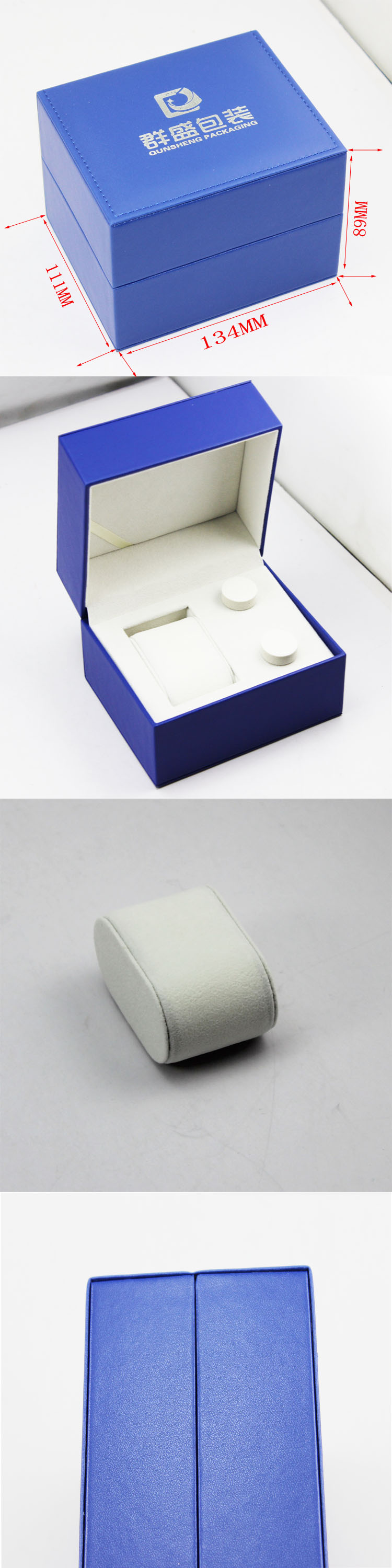 編號:QS-JS099Z 規(guī)格:134*111*89mm 起訂量:1000PCS LOGO:盒面無LOGO 顏色:藍(lán)色 樣期:七天 貨期:確認(rèn)大貨樣20個工作日 描述:PU皮包膠胚,內(nèi)飾為絨布,配工字形枕頭