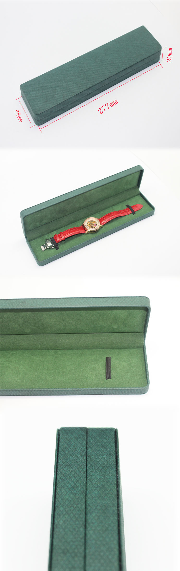 編號(hào):QS-JS119Z 規(guī)格:277*68*20mm 起訂量:1000PCS LOGO:盒面無(wú)LOGO 顏色:綠色 樣期:七天 貨期:確認(rèn)大貨樣20個(gè)工作日 描述:紙質(zhì)包膠胚,內(nèi)飾為絨布
