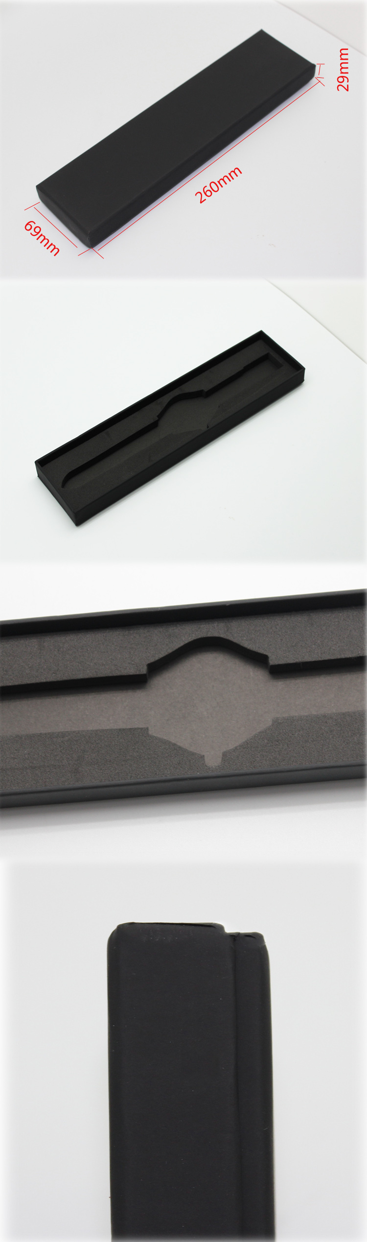 編號:QS-JZ041Z 規(guī)格:260*69*23MM 起訂量:1000PCS LOGO:盒面無LOGO 顏色:黑色 樣期:七天 貨期:確認大貨樣20個工作日 描述:紙質(zhì)包紙胚,內(nèi)飾為EVA