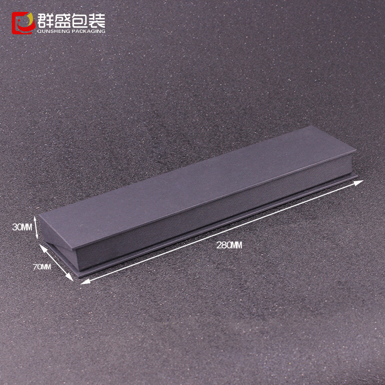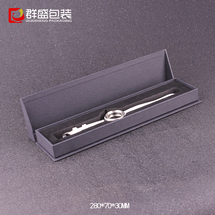 編號:QS-JZ031Z 規(guī)格:280*70*30MM 起訂量:1000PCS LOGO:盒面燙銀色LOGO 顏色:黑色 樣期:七天 貨期:確認大貨樣20個工作日 描述:特種紙包卡紙,底座絨布裱EVA開槽放手表