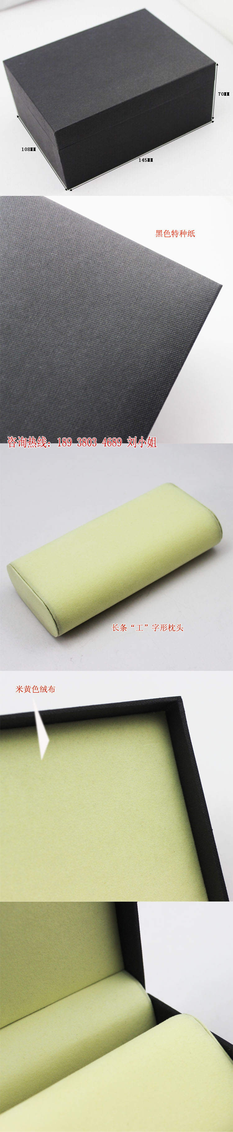 規(guī)格:145*108*70MM 起訂量:1000PCS LOGO:盒面壓印LOGO 顏色:黑色 樣期:無LOGO 貨期:確認(rèn)大貨樣20個(gè)工作日 描述:特種紙包膠胚,內(nèi)飾為絨布,配工字形枕頭